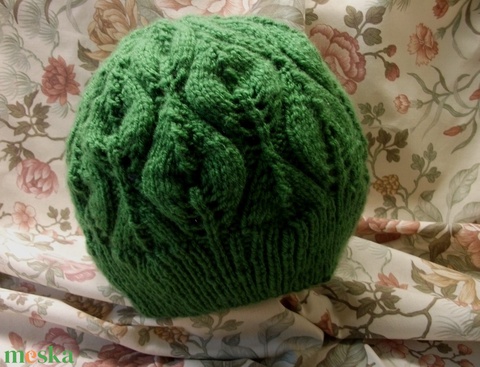 Lomb-zöld, levél mintás áttört kötött sapka