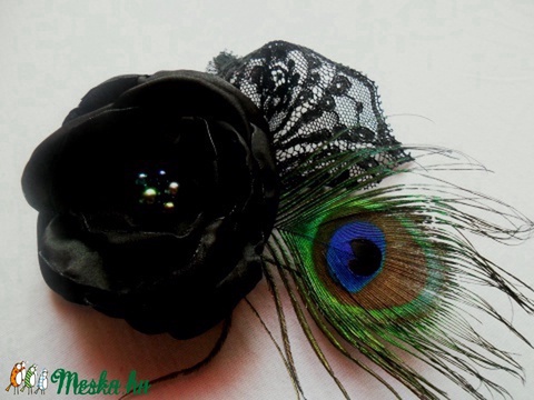 szatén, pávatoll, gyöngy, csipke
