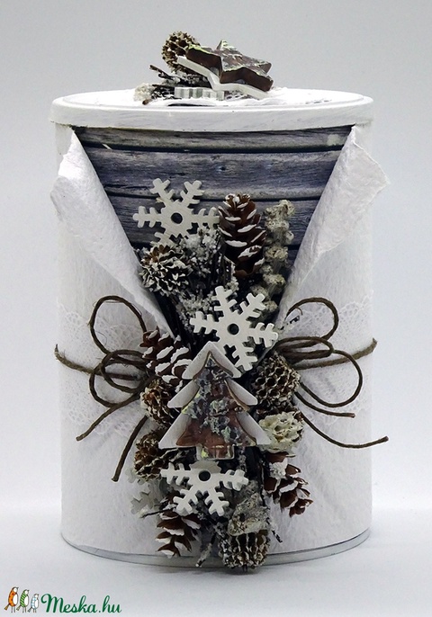 fémdoboz, konzerv doboz, merített papír, kreatív karton, termések, fa díszek, kerámia díszek, csipke, kenderzsinór, akril