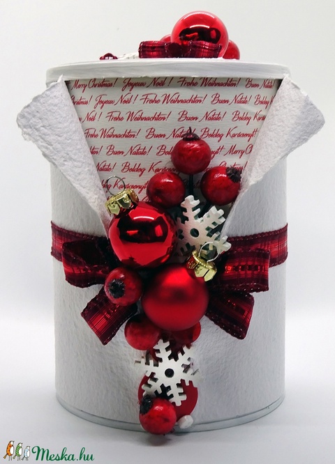fémdoboz, merített papír, kreatív papír, karácsonyi gömbdísz, műanyag díszek, gombok, fa díszek, fémszálas szatén szalag, akril festék, konzerv doboz