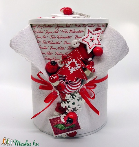 fémdoboz, merített papír, kreatív papír, karácsonyi gömbdísz, műanyag díszek, gombok, fa díszek, fémszálas szatén szalag, akril festék, konzerv doboz