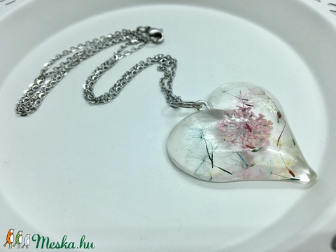 Szivárványszínre festett igazi pitypangmagok és szárított virág-nagy szív műgyanta medál