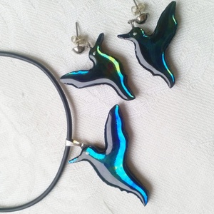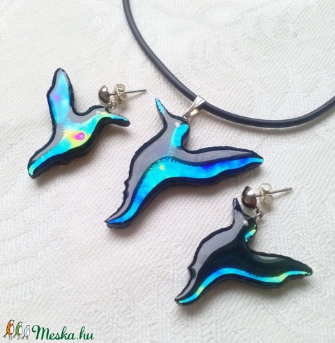 - Anyaga: spektrum üveg irizált liáskék, üvegfesték, 3d üveglakk, ezüst medálkapocs, medálszíj, ezüst fülbevaló alkatrész
