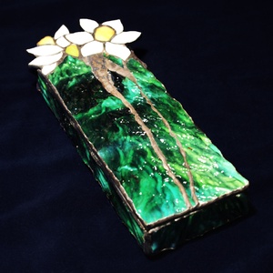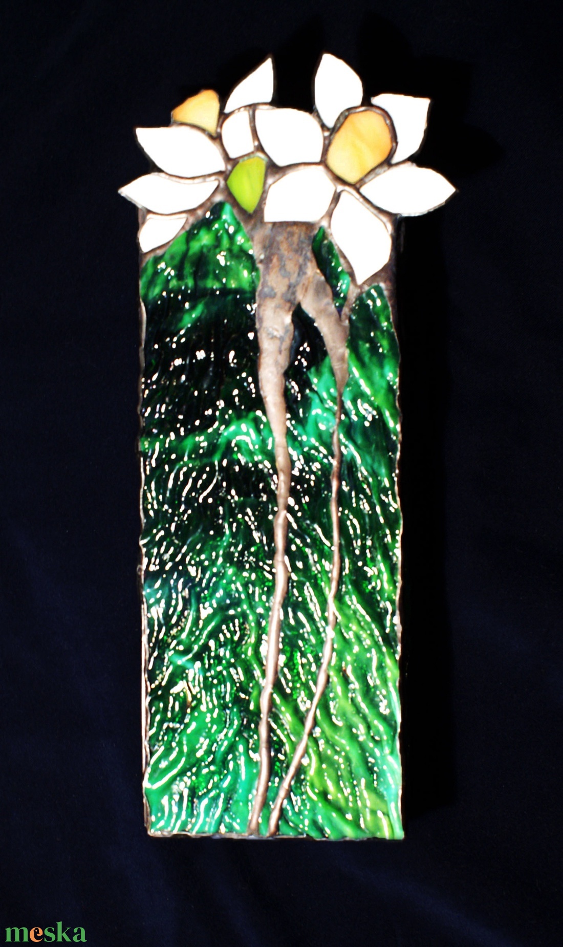 - Anyaga: uroborosz üveg fűzöld, wissmach üveg fehér és sárga, patina, rézfólia és u.ólomprofil, rézzsanér, ón ólom forraszanyag, üveg gyöngyök