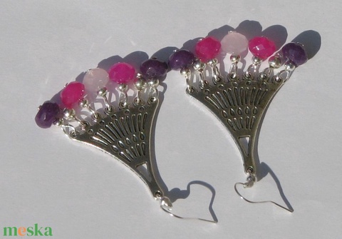 Lila, pink és rózsaszín fazettált jáde ásványfánkokkal díszítettem a legyező formájú fülbevaló alapot.