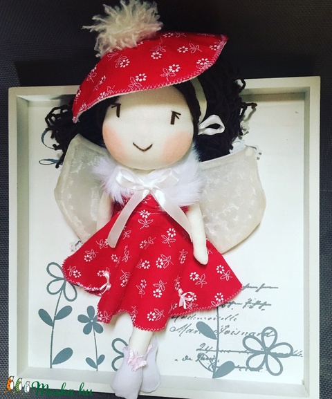 Piros kékfestő ruhacskás angyal baba,kézműves baba, textilbaba, rongybaba