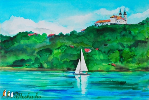 EREDETI akvarell festmény, Tihany, Balaton, Vitorlás, Vitorlázás