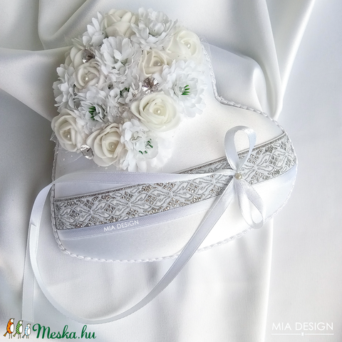 Ezüst-fehér gyűrűpárna, kézzel hímzett hófehér szalaggal