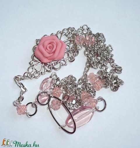 Lazacrózsaszín-ezüst hosszú asszimetrikus nyaklánc rózsával
