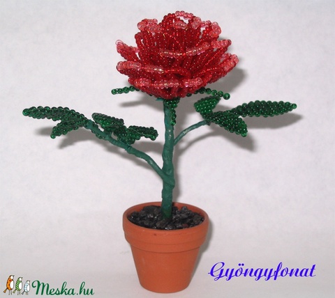 Piros rózsa gyöngyből, cserepes dísz