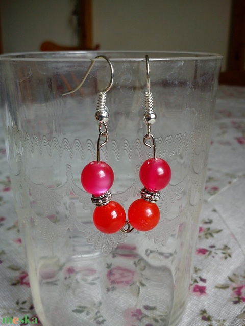 Íves fülbevaló piros és rózsaszín gyönggyel, valamint tibeti ezüsttel
