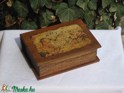 fa doboz, decoupage papír, repesztőlakk, pácolt, ékszer, könyv