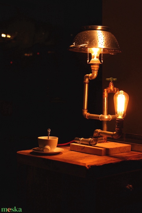 - Anyaga: 1/2 colos acélcső, sárgaréz könyökcső, sóskúti mészkő, edison izzó, 220 betáp, színes textil vezeték, elektromos kapcsoló