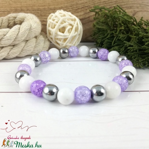 8 mm-es fehér jade, lila roppantott hegyikristály és grafitszürke hematit ásványgyöngyökből készült, 16,5 cm-es karkötő.