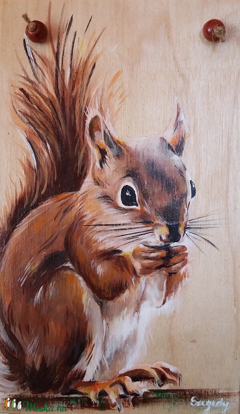 Erdei mókus - akril festmény rétegelt lemezre fagyöngyös akasztóval