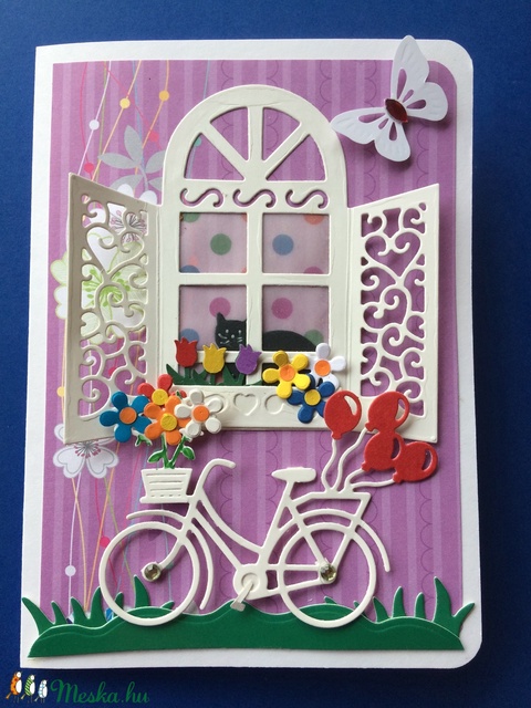 Anyáknapi,születésnapi,névnapi képeslap, bicikli, cica 3D, anyák napja, ablak