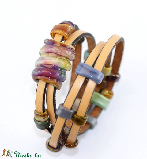 Natura- többsoros bőr karkötő-egyedi üveggyöngyökkelkkel