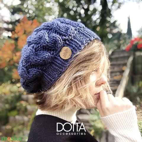 Dotta női kötött sapka - kézzel készült téli beret- meleg puha gyapjús fonalból - farmerkék színben