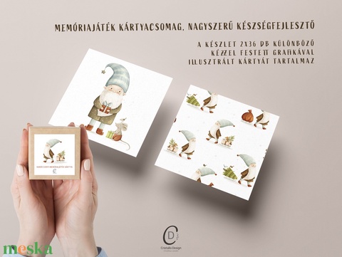 Klasszikus készségfejlesztő memóriajáték, a kedves Mikulásos és erdei állatokkal illusztrált karácsonyi kártyákkal varázslatot csempészhetsz az ünnepi készülődés pillanataiba. A játékot ugyanúgy kell játszani, mint bármelyik más memóriajátékot, a játék célja minél több párt megtalálni és a legtöbb lapot összegyűjteni. A játék során összekeverjük és képpel lefelé szétterítjük a kártyákat, majd a játékosok egymás után felfordítanak 2-2 lapot. Ha párt találnak, begyűjtik őket, ha nem visszafordítják a lapokat, és a következő játékos jön. A játékot az nyeri, akinek sikerül a legtöbb lapot összegyűjtenie, vagyis a legtöbb párt megtalálnia.