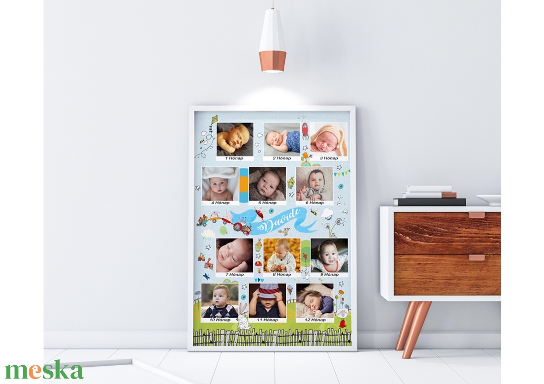 Fényképes kisfiú 12 hónap 1 éves születésnapi poszter kerettel, Egyedi baba poszter Falidekor fotós kellék táblamontáz