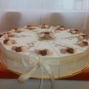 9 szeletes,15 cm-es átmérővel, felülről nyitható, megtölthető változatban. A szeleteket az arany tortaalapon rögzítem a könnyebb nyitás érdekében. Középen, körömmel megemelve nyithatóak és visszazárhatóak. A felcsavart bankjegy épp elfér benne. A szeletekben különböző címletekben rejtheted el, váltogatva idézettel, jókívánságokkal vegyesen.