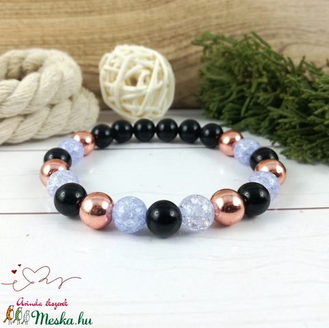 8 mm-es ónix, kék roppantott hegyikristály és rosegold hematit ásványgyöngyökből készült karkötő.