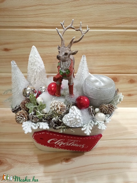 bádogkaspó, szarvas figura, ezüst színű gömbgyertya, gömb betűzők, dekor fenyő, száraz termések