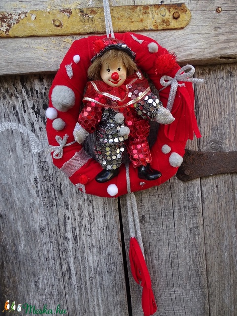 ITT a farsang áll a bál...porcelánfejű - BOHÓC Piros-fehér ezüst,szürke kopogtató,ajtódísz,falidísz ,koszorú