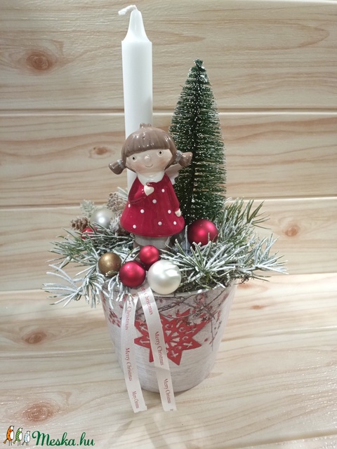 kerámia angyal, kerámia kaspó, havas fenyőág, gyertya, gömbök, dekor fenyő zöld