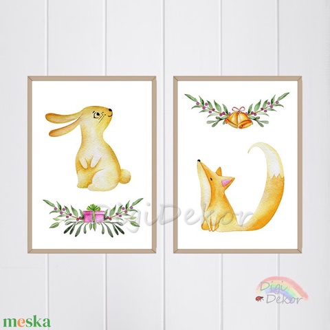 Állatos faliképek gyerekszobába, róka, nyuszi, őszi, karácsonyi dekoráció, nyomtatott falikép, akvarell, gyerekeknek