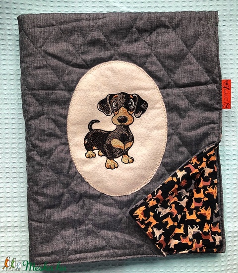 Aprólékos kidolgozású gyönyörű Tacskó mintát géppel hímeztem gyapjú filcre, majd azt rögzítettem szintén hímzéssel a szteppelt sötétszürke pamut anyagra. A szteppelt anyag belső felén egy vékony réteg vatelin van. A pléd háta kutya mintás minőségi puha pamut flanel.