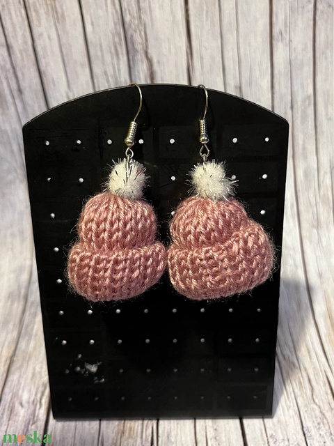 - Anyaga: fülbevaló alap, ezüst kiegészítők, kötött sapka, pompom