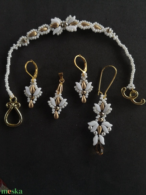 - Anyaga: stormduo, dropduo, swarovski gyöngy, cseh 3mm csiszolt gyöngy, toho kásagyöngy, miyuki kásagyöngy, miyuki cérna, karkötő alap, medál alap, fülbevaló alap