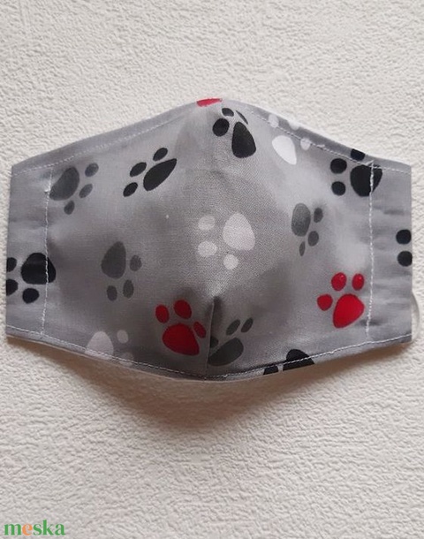 Pamutvászonból készült, kétrétegű, szürke alapon tappancs nyom mintás - gyermek méretű - textil szájmaszk.
