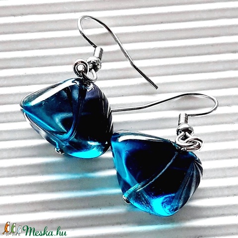 Óceánmély üveggyöngy lógós fülbevaló rozsdamentes acél akasztón, üveggyöngy ékszer
