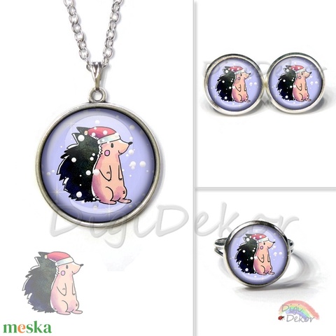 Süni a hóesésben, többféle minta, karácsonyi nyaklánc kislányoknak, aranyos állatos ékszer, süni, sündisznó, tél