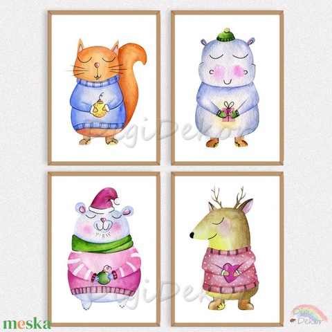 Karácsonyi faliképek gyereszobába babaszobába, vicces állatok, téli dekoráció, mókus, víziló, maci, szarvas, A4-es print