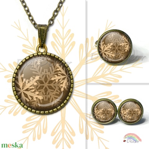 Barna bronz hópelyhes ékszerszett, karácsonyi ajándék nyaklánc, hópehely-mintás-medál
