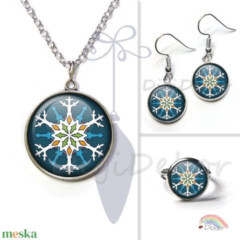 Karácsonyi hópelyhes nyaklánc, téli ékszerszett, kék-fehér hópihés medál, téli ajándék