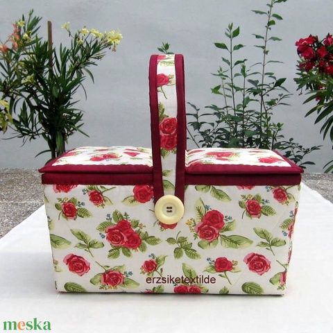 Varró- vagy kézimunka kosár bézs alapon rózsás (Varrókosár)