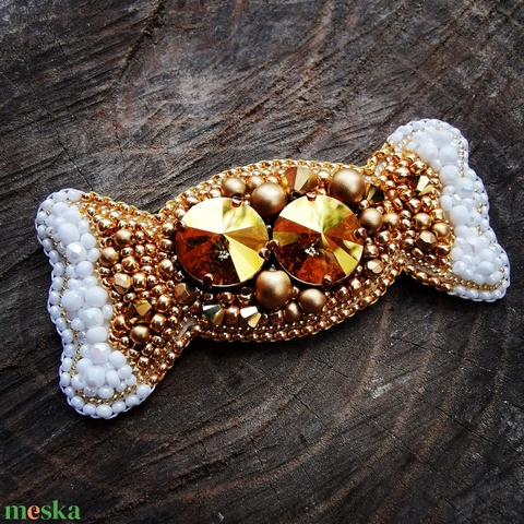 - Anyaga: gyöngy, bőr, ragasztó, gyöngyímző cérna, fém bross tűző, gyöngy
