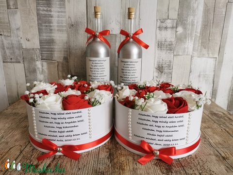 Mivel kézzel készült termékről van szó így árnyalati különbségek előfordulhat valamint a szöveg mellé strassz vagy gyöngy sor kerül ez változó. A képen lévőek csak illusztrációk az ár egy darabra vonatkozik.A díszüveg nyaka átlátszó vagy barna ez változó. A kért szöveget a rendelés során lévő megjegyzésbe lehet megírni vagy ha oda nem fér akkor üzenetben kellene átküldeni úgy,hogy a szöveg megírása során ügyeljenek a helyes megszólításra is ,hogy kinek szól majd az idézet valamint ha dátumot kérnek rá azt is írják oda.Tehát a boxra és díszüvegekre kért szöveg kompletten legyen átküldve ami rá kerüljön majd a termékre. A termékek elkészítési ideje 10 munkanap de igyekszünk minél hamarabb elkészíteni :)