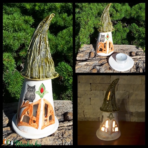 Manóházikó és mécsestartó lakásban vagy kertben . Fehér agyagból kézi formázással készült 2x égetett részben mázas kerámia.Díszíti kerted,virágcserepeid vagy eppen kellemes hangulatot ,háttérfényt biztosít .Mérete:kb.17 cm magas és a lenti átmérője 6,5 cm .Az alátét korong 9 cm átmerőjű.Kedves vásárló a mécsestartókat mindig gondosan használd , kerüld a könnyen gyúló anyagok közelségét illetve tartsd szem előtt,hogy a lángtól a kerámia felmelegedhet!!Ma már kapható elemes mécsessel is használható! Boltunkban minden alkotás kész termék ezért akár azonnal megvásárolható .