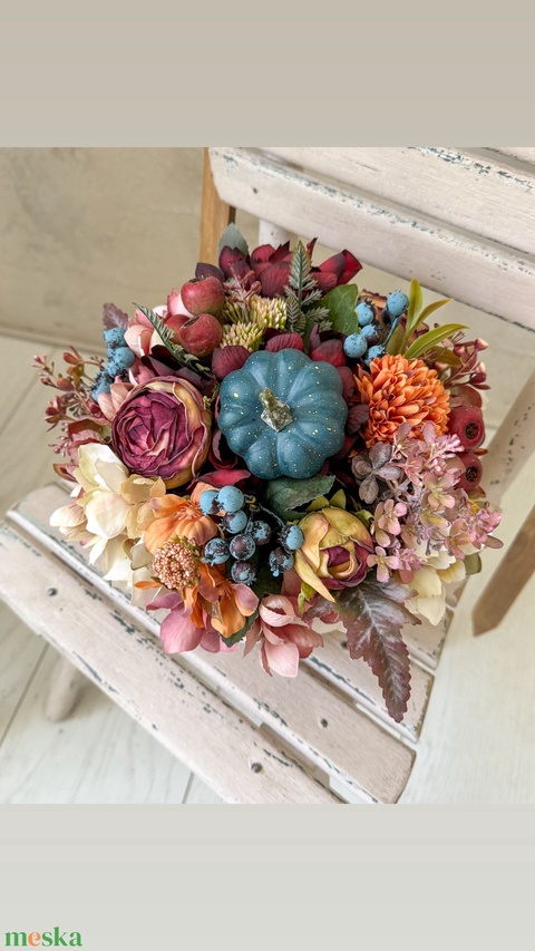 Vintage pasztell őszi selyemvirágos asztaldísz - virágdísz - tökös asztaldísz - tökdísz