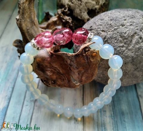 Boldog beteljesedés tejopál és vörös turmalin ásvány karkötő