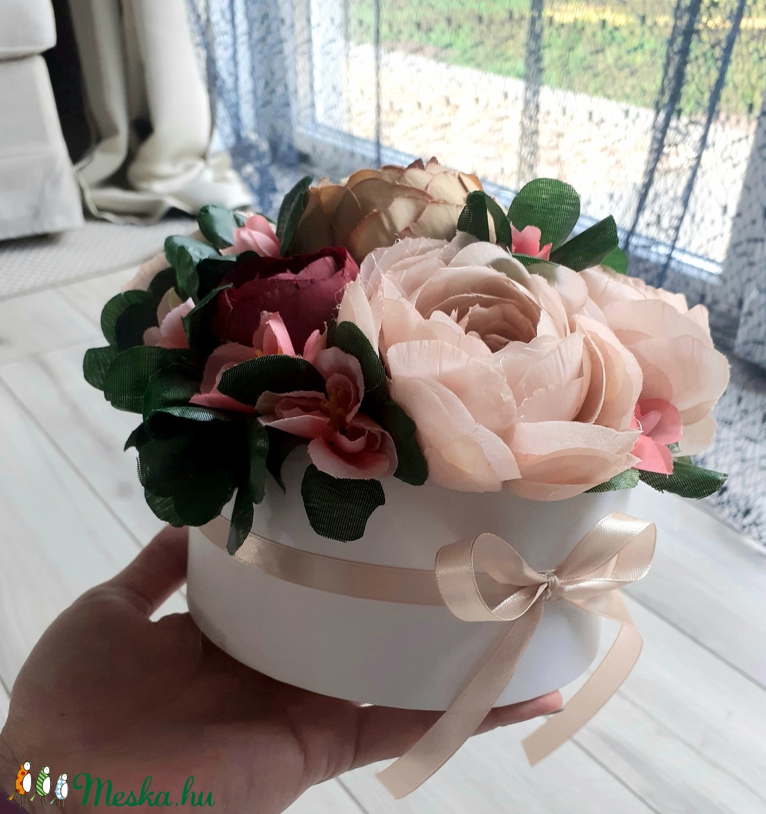 Tavaszi virágbox, asztaldísz, ajándék kellemes színekkel, anyák napja