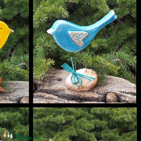 Fehér agyagból kézi formázassal készítettem ezeket a kis színes madárkákat.A talpazat is agyagból készült amelybe a madárka lábát ragasztottam.Teljes magassága:13,szélesség 12 és 9 cm. Már csak a türkiz színű vásárolható meg!Boltomban minden alkotás kész termék ezért akár azonnal megvásárolható.