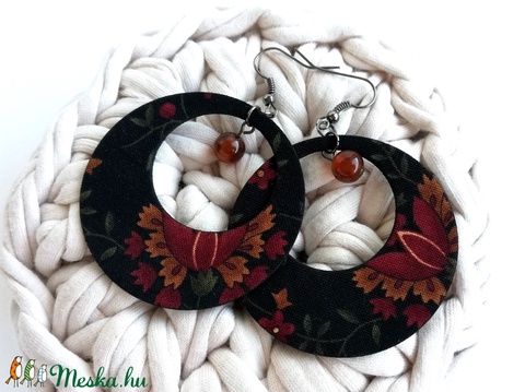 Fekete alapon elegáns növényi mintás, gyöngyös Maxi textilfülbevaló - sötét ősz