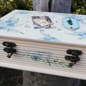 - Anyaga: fa, akrillakk, akrilfesték, szalvéta, szalag, csipke, strassz, gyöngy, transzfer, fém