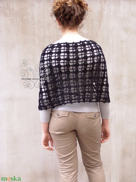 Fekete horgolt csipke poncsó rózsákkal aszimmetrikus kepp